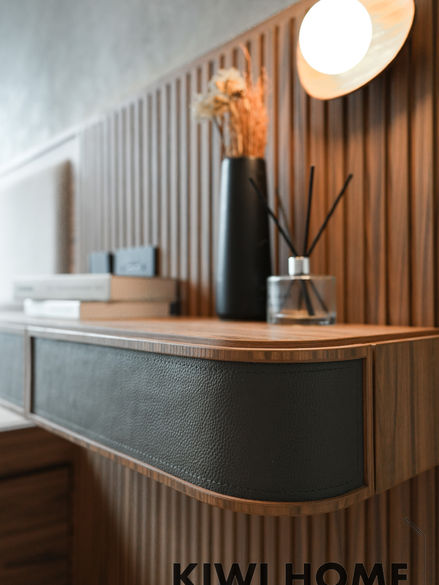睡房嘅特色係床頭位置,因為用上日本具質感嘅特色牆紙,加上配合床頭滲光燈嘅效果,更加特顯牆紙既凹凸紋,而且床頭都櫃同衣櫃位都帶有車線皮設配計搭嘅皮革飾面,突顯成熟感。
